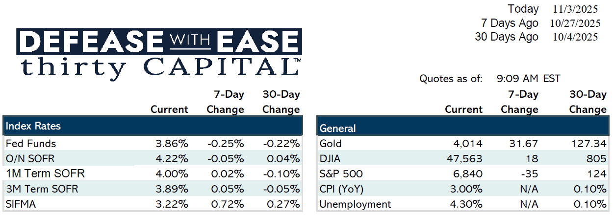 Rates rose modestly, with the 2-year swap up 11 bps to 3.37% and the 10-year up 9 bps to 3.65%. Overnight SOFR is trading near 4.04%. Borrowers who executed hedges early benefited from lower prior rates, reinforcing the need for proactive risk management amid uncertainty.