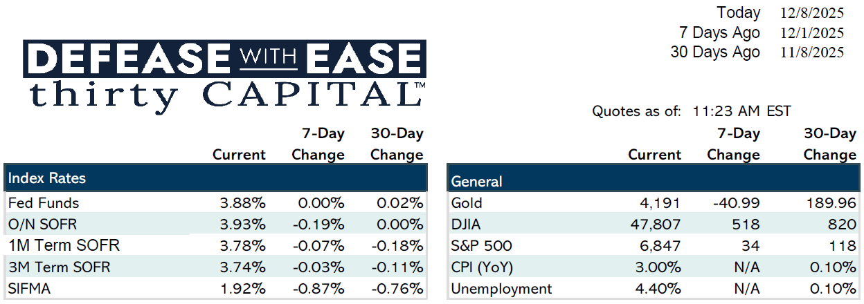 Markets pulled back last week as stronger labor data and mixed manufacturing readings pushed yields higher across the curve. Overnight SOFR eased to 3.93%, with one-month SOFR at 3.78 but tightening.