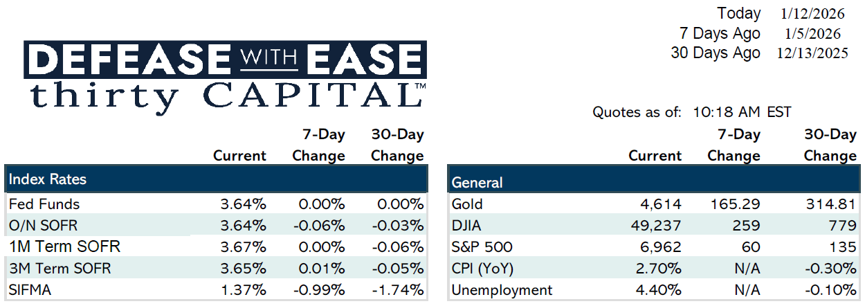 Treasury markets remain notably stable, with the 10-year yield trading in a narrow 3.9%–4.3% range. This stability, along with normalized credit spreads, continues to present a favorable execution window for fixed-rate borrowers.